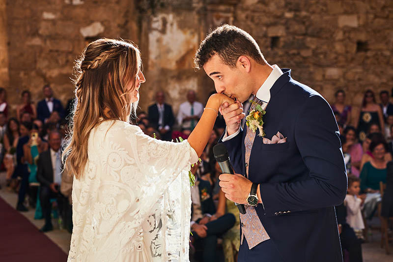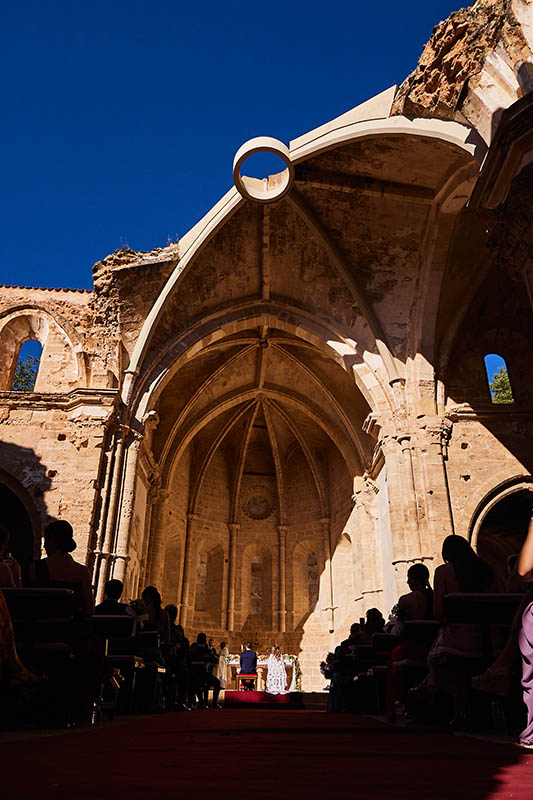 La iglesia semi-derruida del monasterio se convirtió en el escenario de su compromiso. A pesar del calor, la luz del día realzó la magia del lugar. La ceremonia, al aire libre y cargada de simbolismo, selló su amor en un entorno histórico que resonaba con emociones.