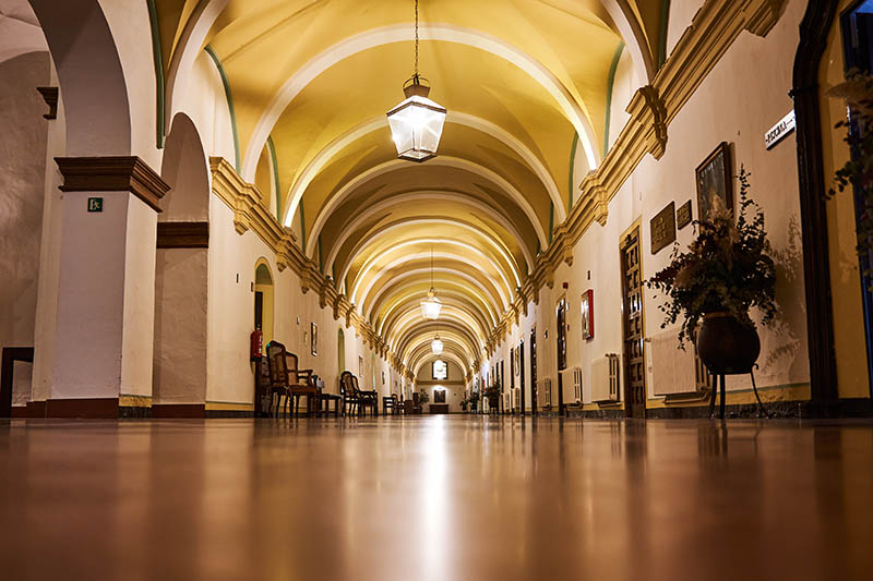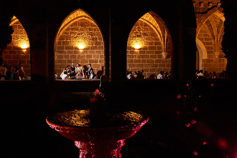 El majestuoso claustro del Monasterio fue el escenario de un banquete único. Resonando con risas y bullicio, las fotografías capturaron la esencia de una cena viva y emotiva, y un poco alocada. El corte de la tarta junto a la fuente central del claustro fue un momento mágico, marcando la transición hacia el baile nupcial.