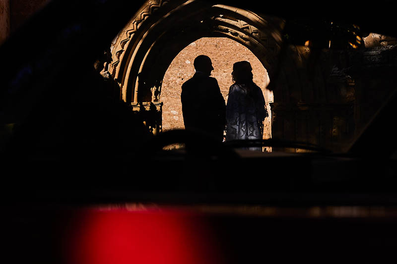 El cóctel, animado por la llegada triunfal de Raquel y Javier en un coche con bengalas de colores, brindó oportunidades para fotografías espontáneas y emociones compartidas. La luz del atardecer pintó un escenario perfecto mientras explorábamos rincones del monasterio, capturando momentos irrepetibles de pura alegría.