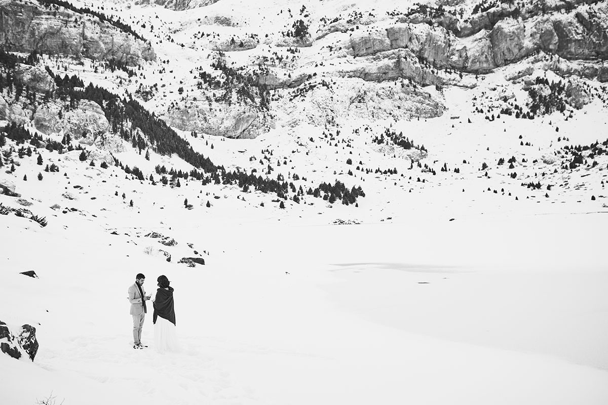 Afortunadamente, aunque con cierta dificultad, pudimos llegar hasta el mismo Ibón. La dificultad del camino con los trajes y todo el material quedó borrada de un plumazo cuando atisbamos el Ibón totalmente helado y rodeado de nieve. Había costado, pero una vez allí Tábata y Fernando supieron de lo mágico que iba a ser ese momento.