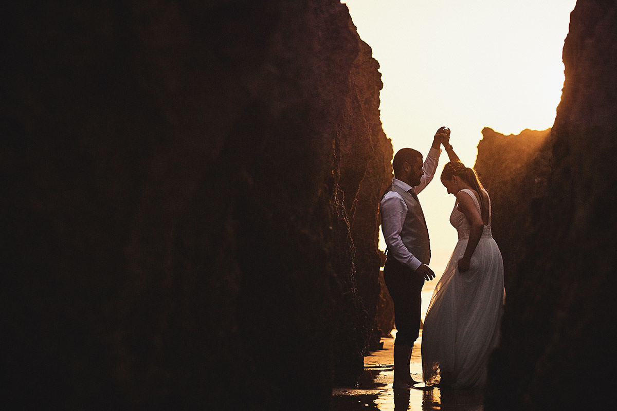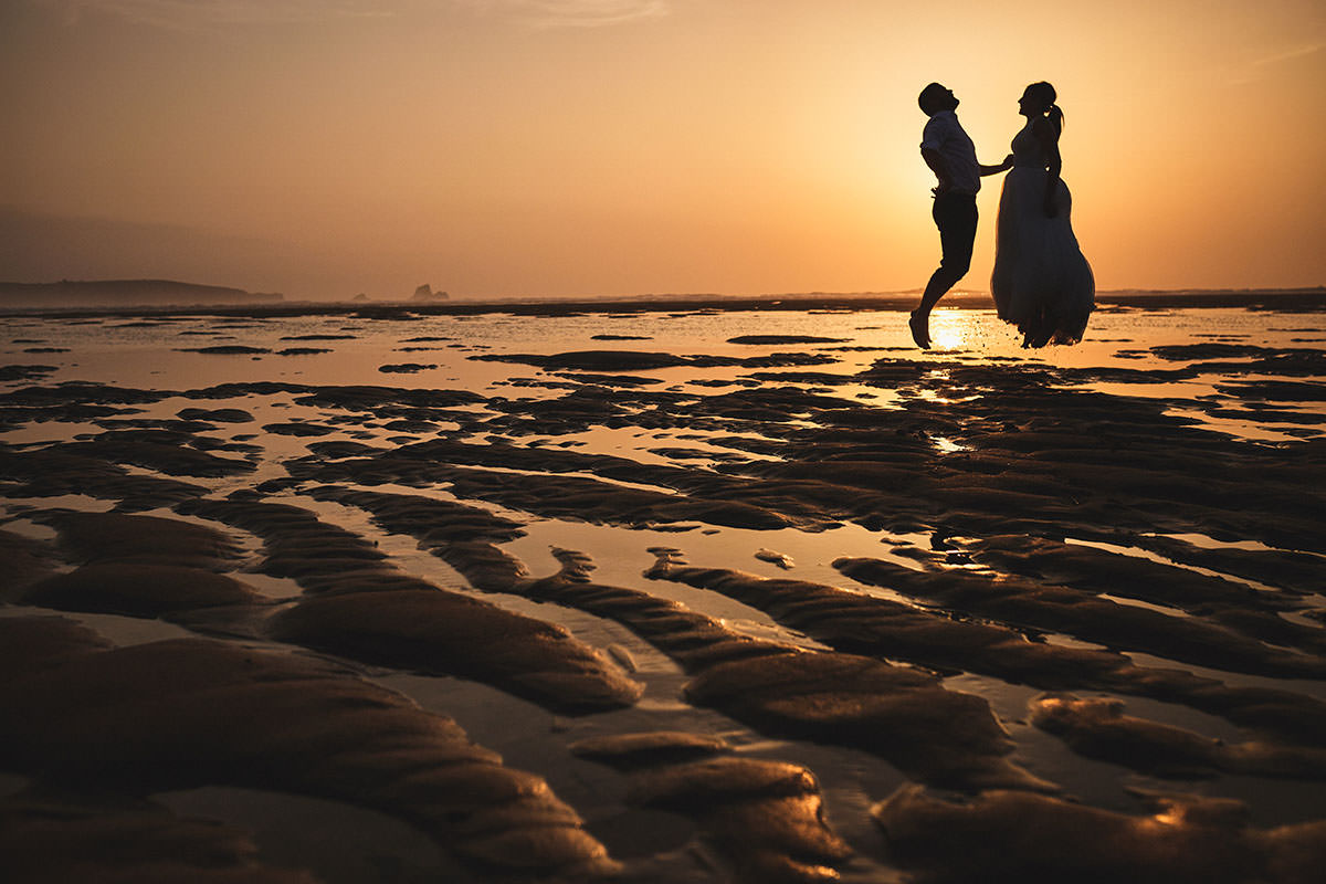 Aunque no es norma escrita, buena parte de las parejas optan por concluir sus sesiones en la Playa. Y a mí, personalmente, me parece una gran idea. Una puesta de sol, unos colores alucinantes, un cielo de ensueño, una pareja enamorada y un paisaje bucólico son ingredientes más que suficientes para que yo no pueda amar más mi trabajo. Siempre que llego a este punto quiero que el reloj y el sol se paren para poder disfrutar de la mejor profesión del mundo. Cada disparo, cada foto y cada encuadre son pura energía.