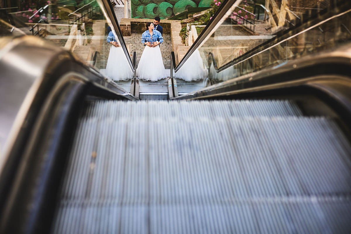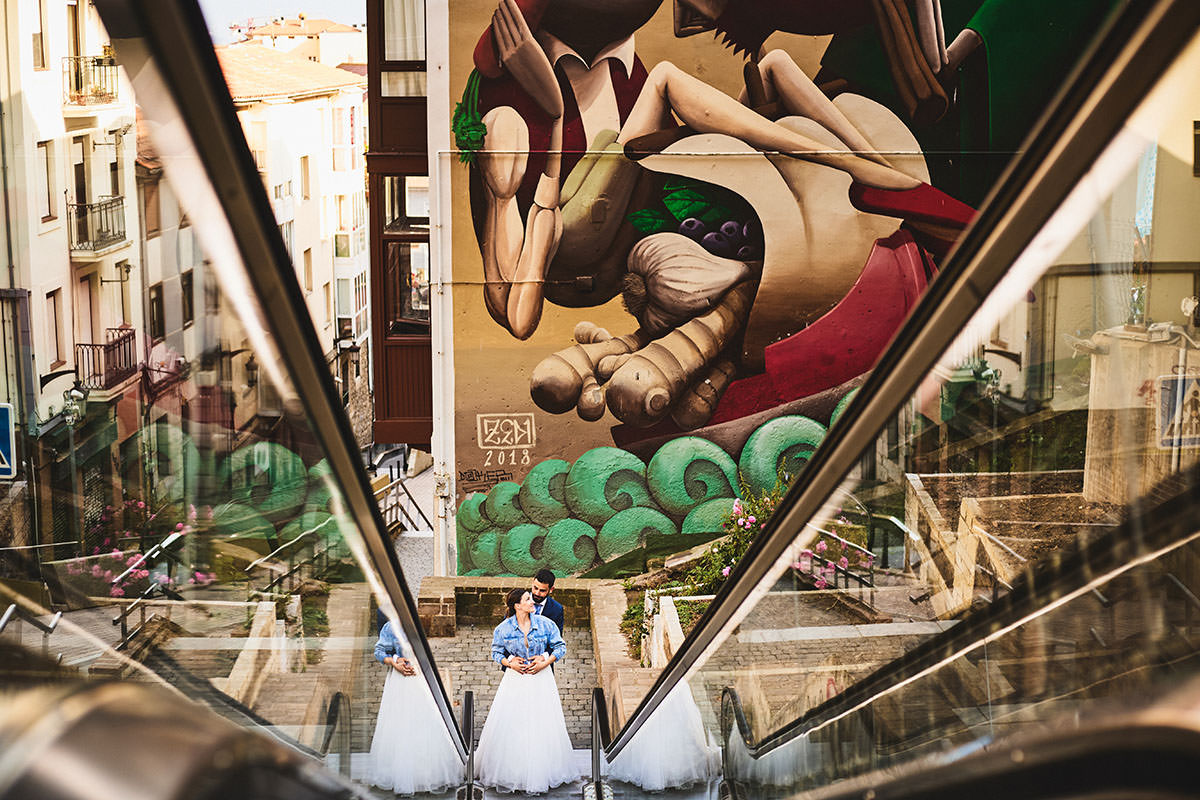 Una vez que dimos por concluido este tramo de la Post boda en Santander, nos dirigimos al centro de la ciudad para hacer unas tomas muy diferentes. En este caso apostamos por una fotografía más urbana. Entre grafitis y escaleras mecánicas hicimos unas imágenes más creativas y actuales.