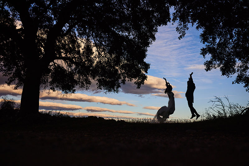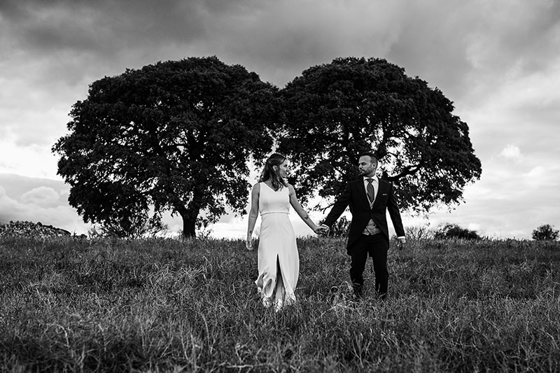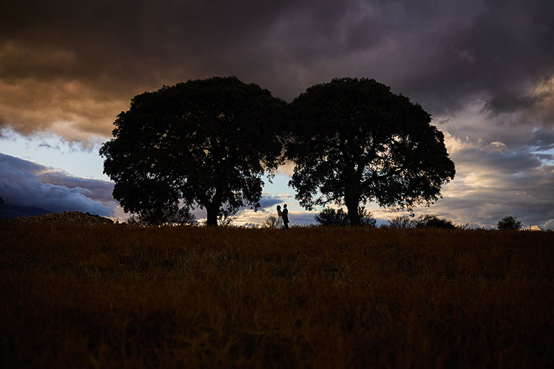 El Monasterio de Veruela, nuestro destino original, nos cerró sus puertas, pero en la búsqueda de alternativas, descubrimos dos encinas aisladas en mitad de la nada. Aquí, mi creatividad tomó las riendas, jugando con simetrías, formas y la elegancia innata de Laura y Samuel. La soledad de estos árboles se convirtió en un escenario íntimo, donde cada pose, cada gesto, se fusionó con la grandiosidad del entorno.